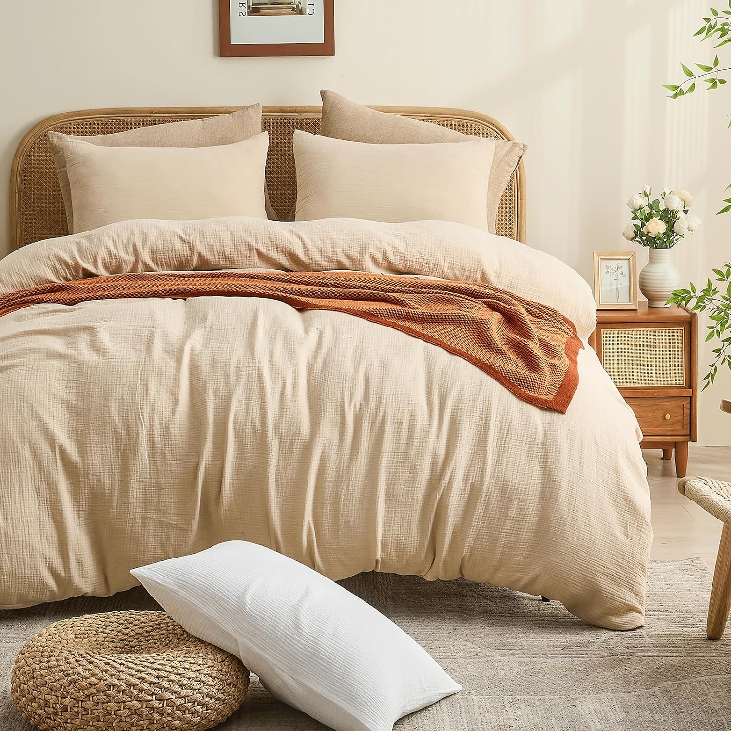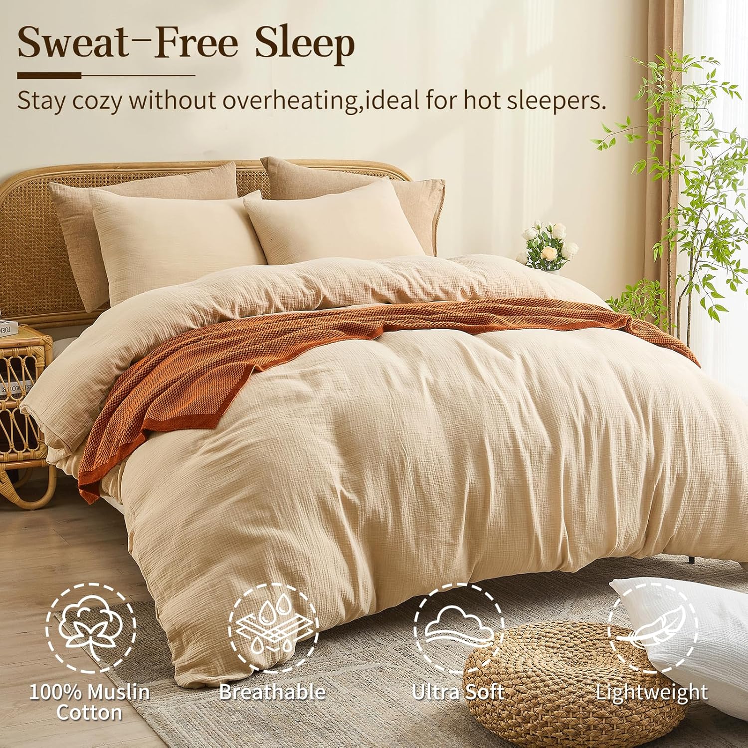- Breathe Better, Sleep Dry: Muslin Duvet Cover Queen Featuring an innovative gauze weave, the duvet cover wicks moisture 30% faster than regular cotton. Its temperature-regulating properties keep you cool in summer and cozy in winter, ensuring year-round comfort and a restful night’s sleep.
